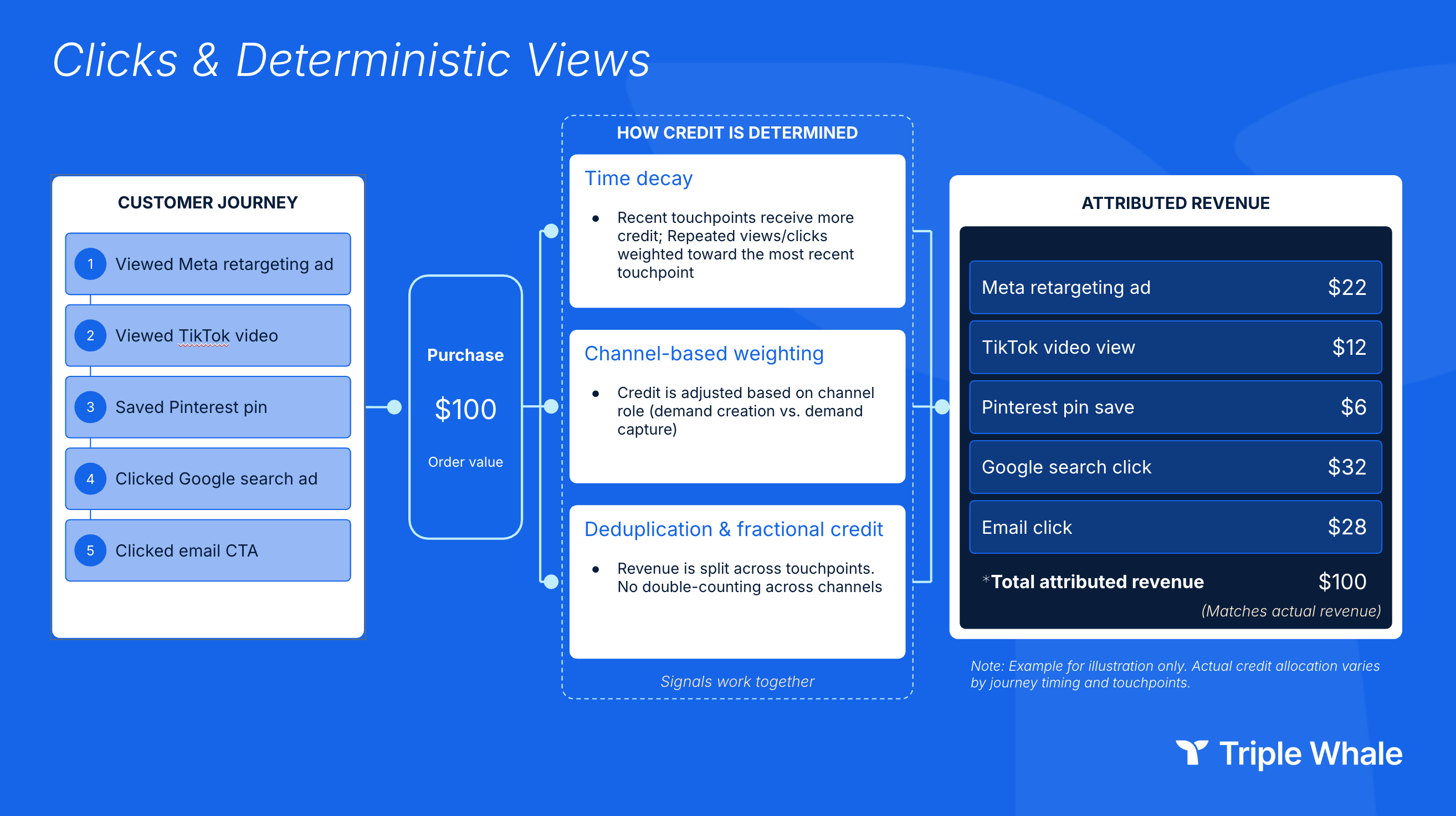 Here’s a simple example. If a shopper views a TikTok video, then later sees a Meta retargeting ad, and finally clicks a branded search ad right before purchasing, Clicks & Deterministic Views assigns more credit to the most recent qualifying interaction, while still recognizing the role earlier views played in building intent.