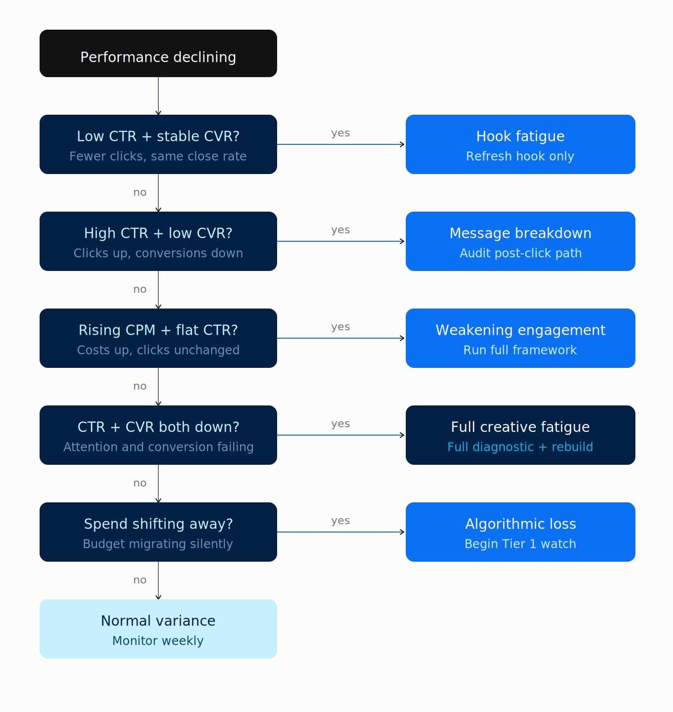 The framework works, but only if it runs every week — including when everything looks fine. Pull your last 30 days of creative performance. Flag every ad where two or more metrics have declined over the past 7 days. For the top three flagged ads, run the diagnostic: name the failure pattern, map it to a metric signature, and brief a replacement that addresses what actually broke.