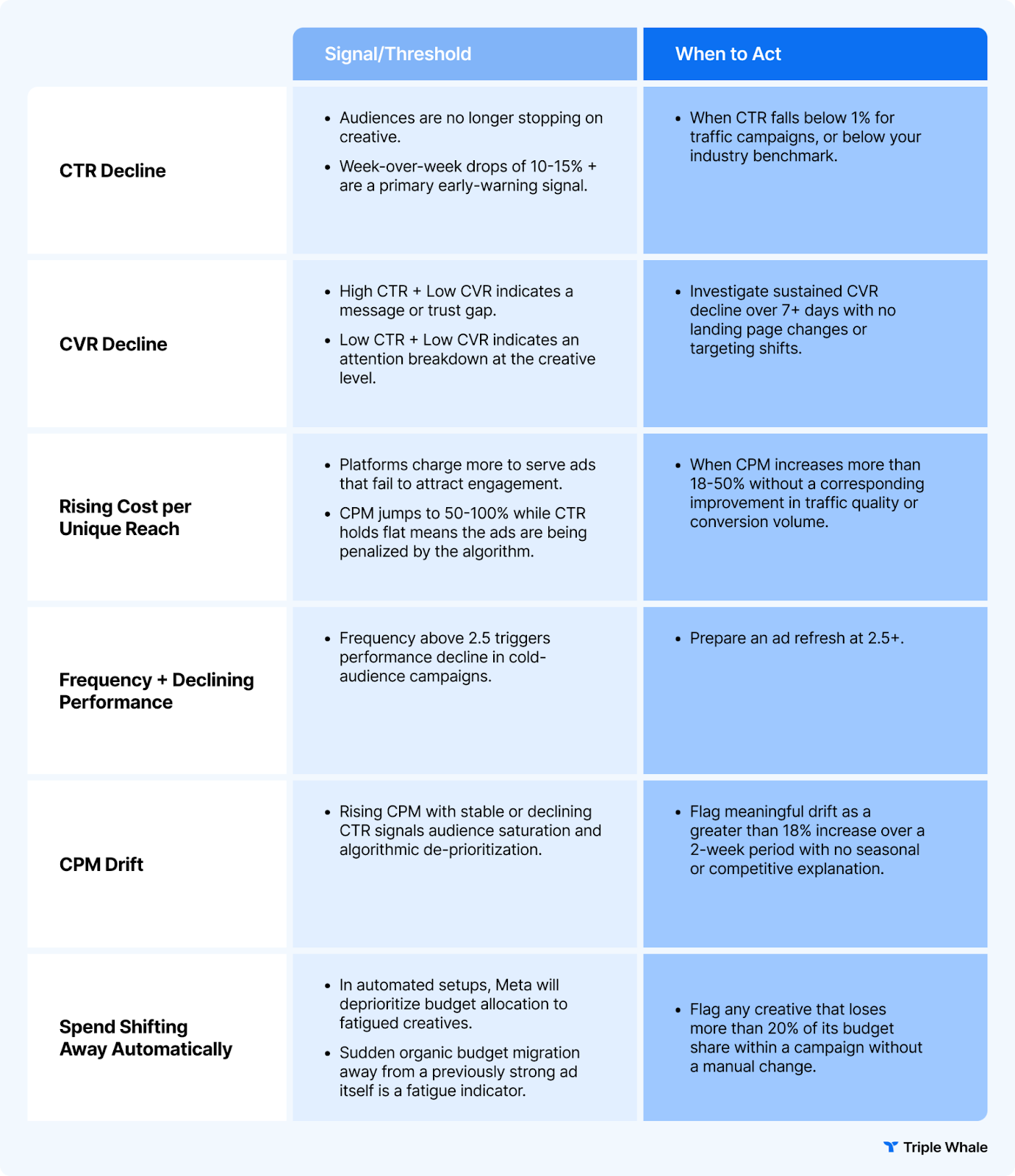 CTR decline is the primary early-warning signal. It means audiences are no longer stopping on the creative. Week-over-week drops of 10–15% or more should get your attention. Industry practitioners generally flag CTR falling below 1% for traffic campaigns as an action threshold.
