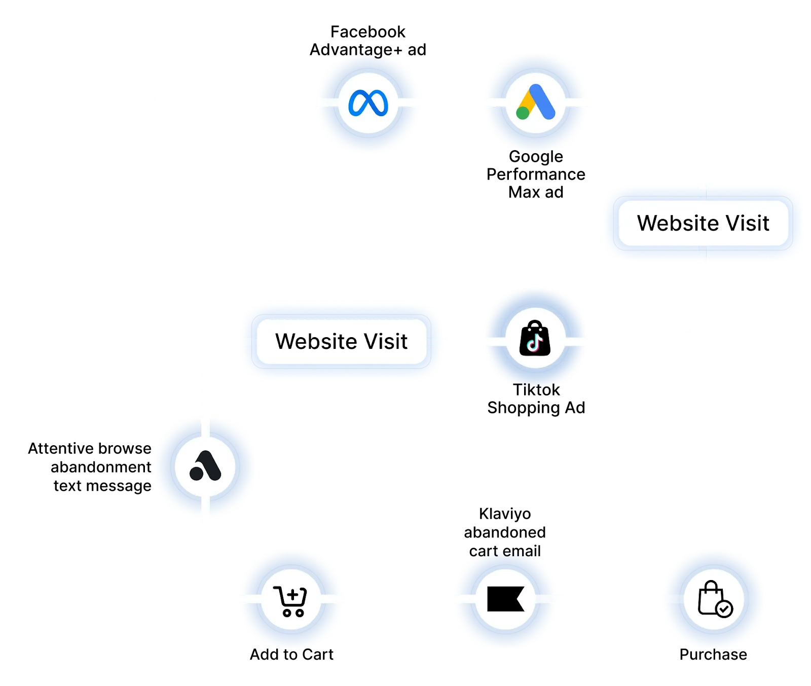Take this example: a customer sees a TikTok ad, later searches your brand on Google, clicks a retargeting ad on Meta, and finally converts through email.