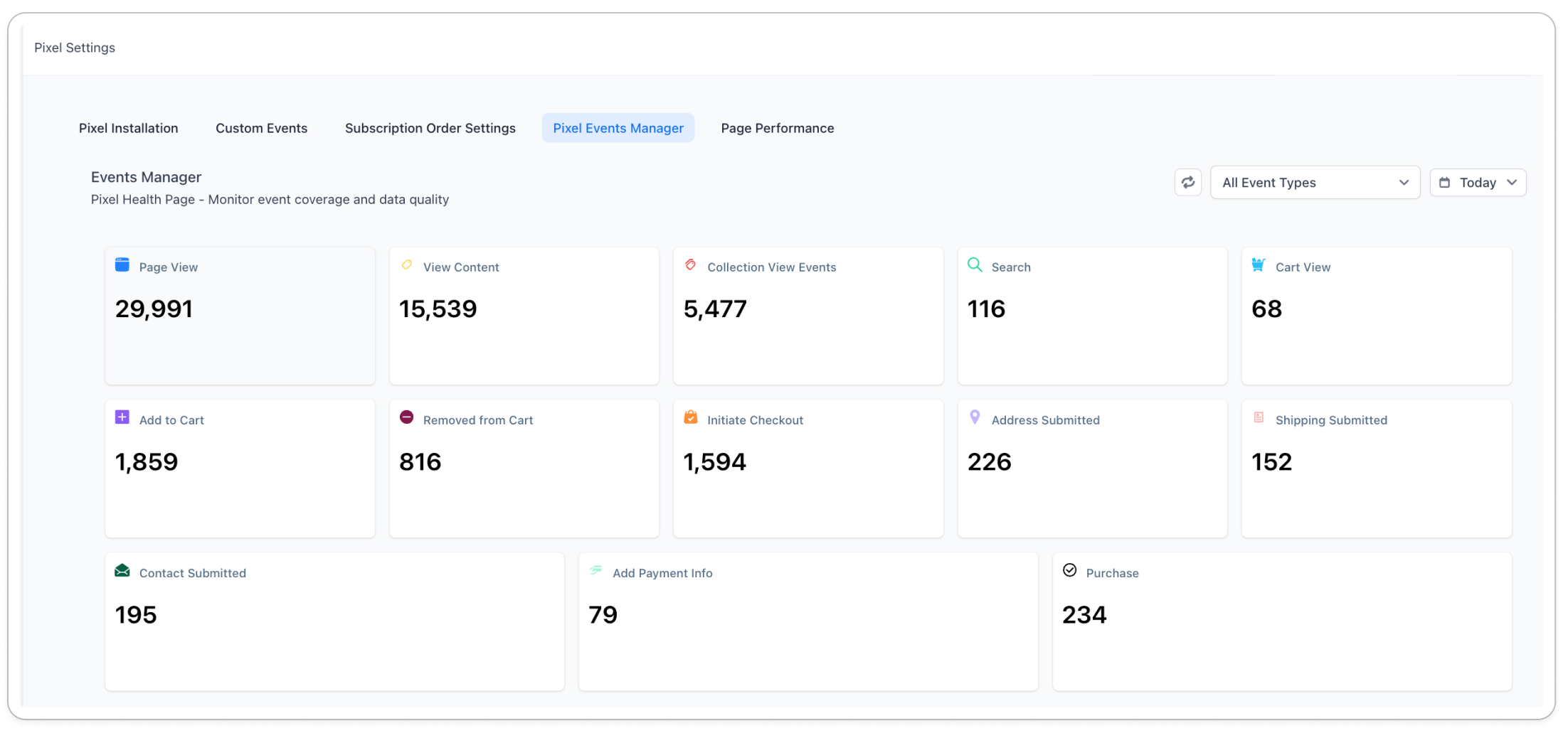 Triple Whale’s Pixel Events Manager gives you a single view of all your pixel tracking, so you can confirm your data collection is working correctly.