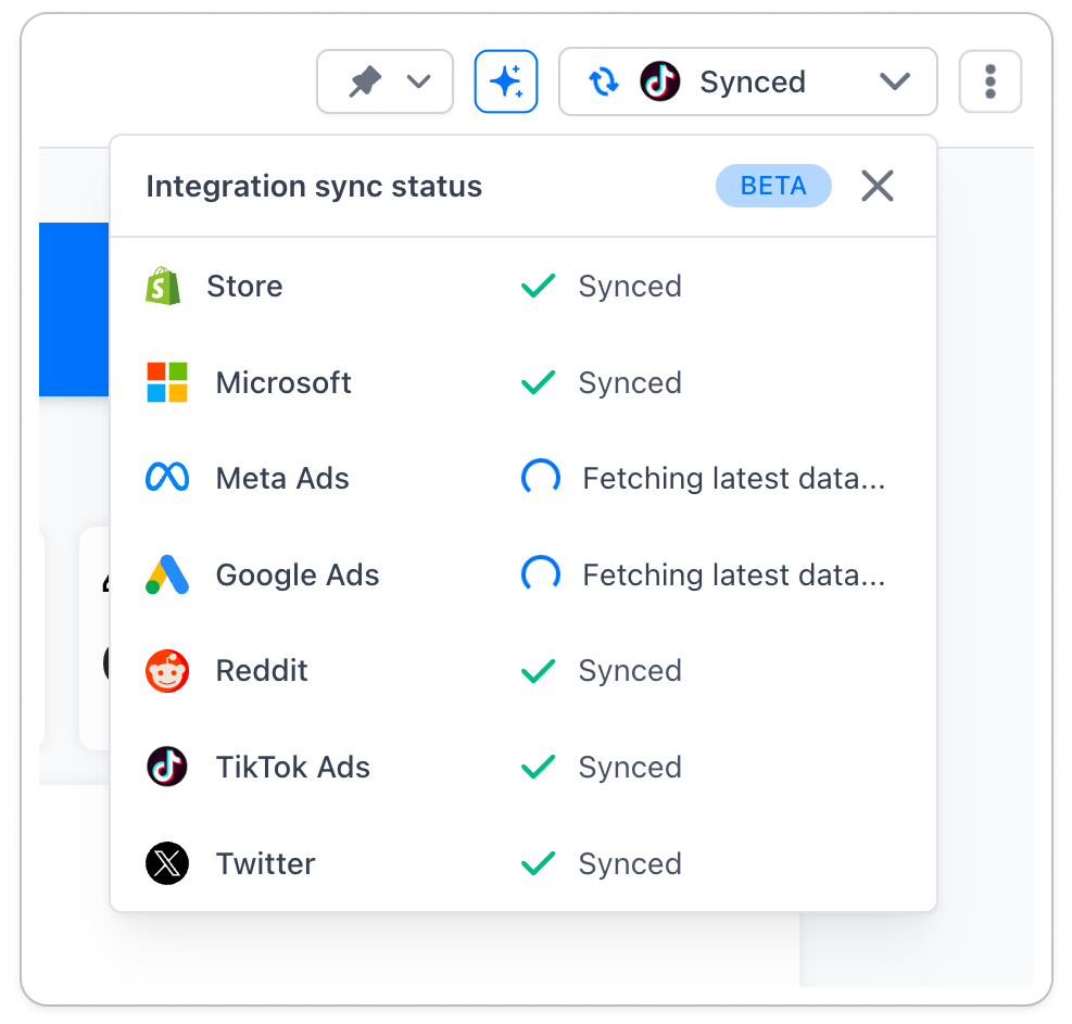 Hit refresh and watch it work in real time, cycling through each integration and displaying its status as fresh data comes in. Need a full picture of where things stand? Expand the dropdown to see every integration and its fetch status at once. The result is visibility into exactly how current your numbers are, so you can report, decide, and act with complete confidence.
