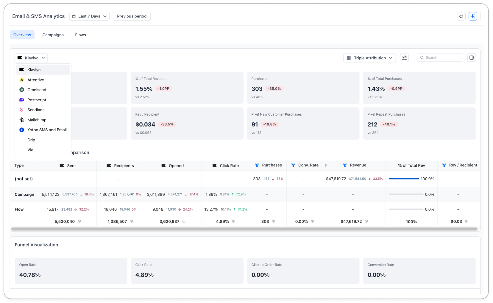 The Email & SMS Attribution Dashboard brings engagement and revenue data together so you can understand how campaigns contribute to overall performance without switching between tools or dashboards. Pull in detailed metrics from Klaviyo, or track revenue from tools like Attentive, Omnisend, and Postscript using UTMs.