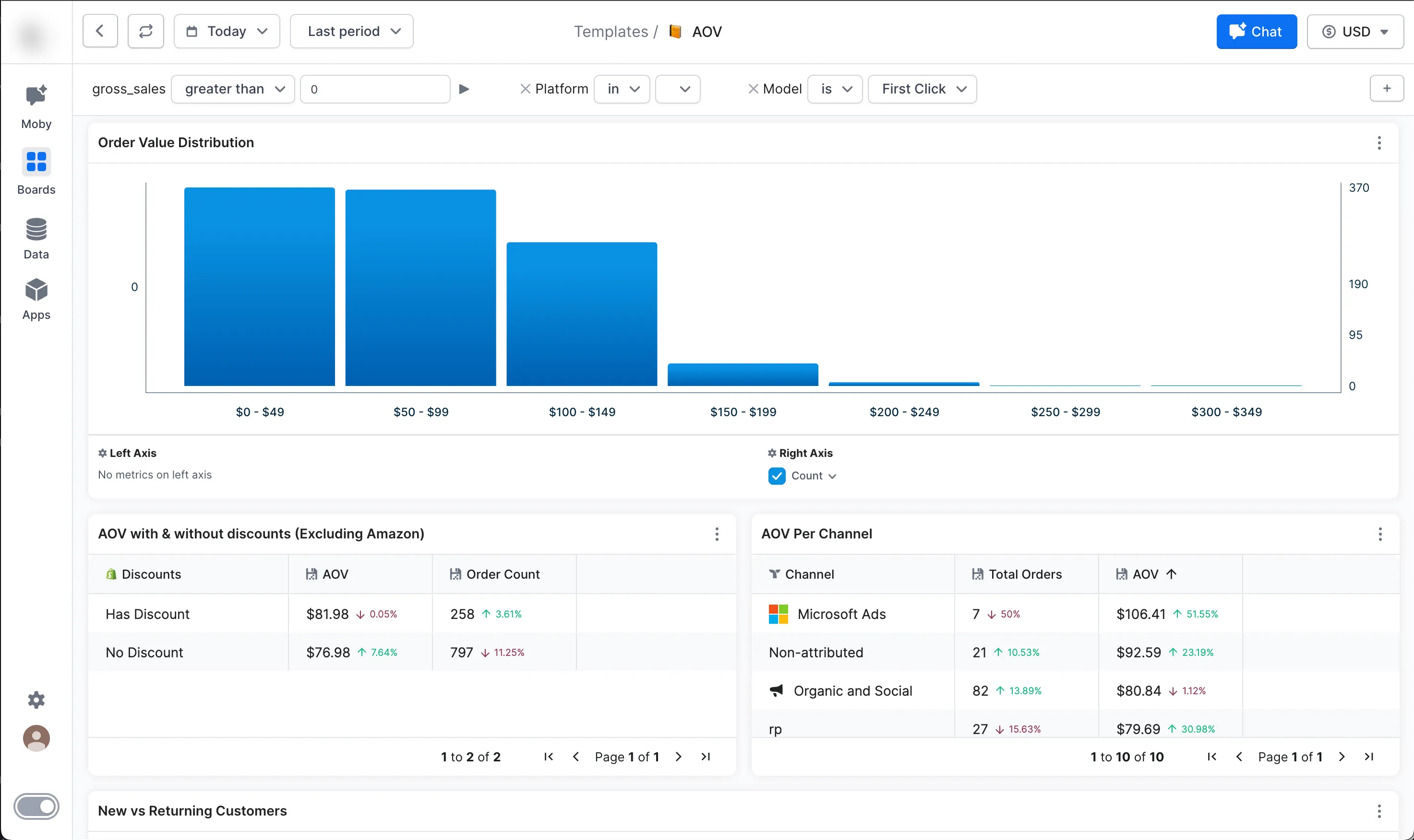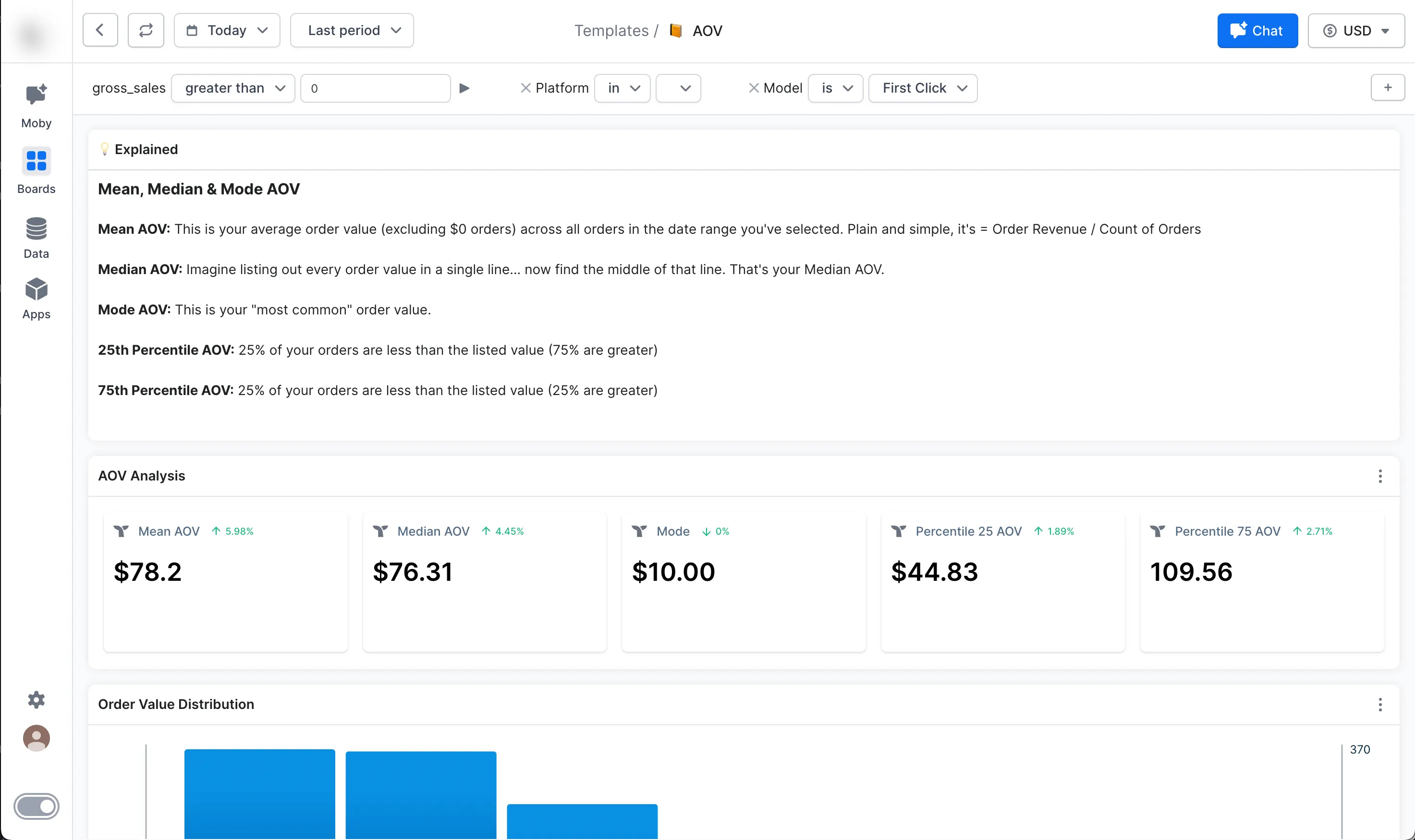 Triple Whale’s customer analytics tools enable you to dig deeper into your customers’ shopping habits, better understand their behavior, and maximize the value they create for your business. Track mean, median, and mode AOV and view the distribution across customers.