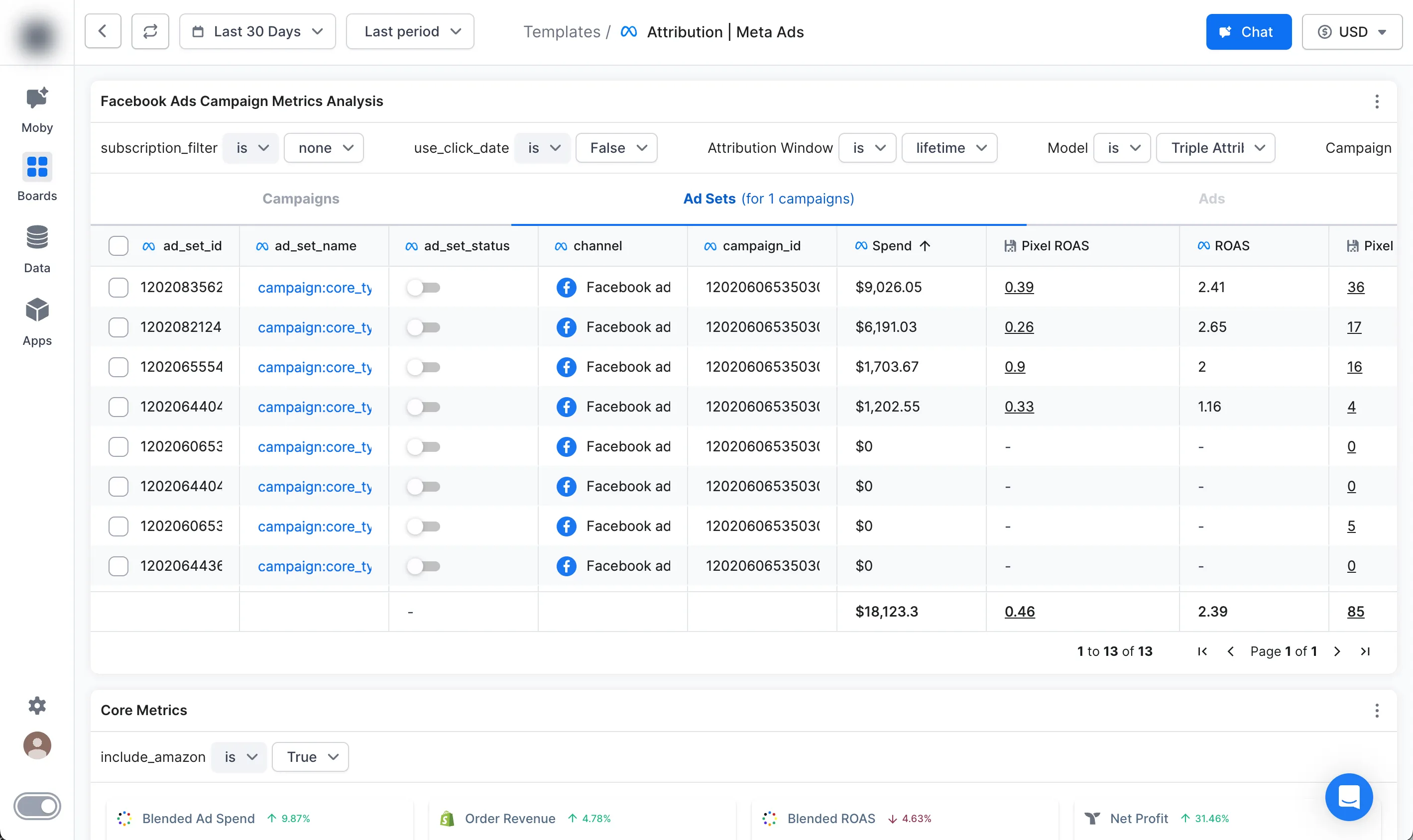 This Board is a comprehensive tool designed to provide ecommerce brands with in-depth analysis and performance metrics of their Facebook Ads campaigns. Using Triple Whale's 7 attribution models and built-in AI chat to offer precise and actionable insights, brands can optimize their advertising efforts effectively.