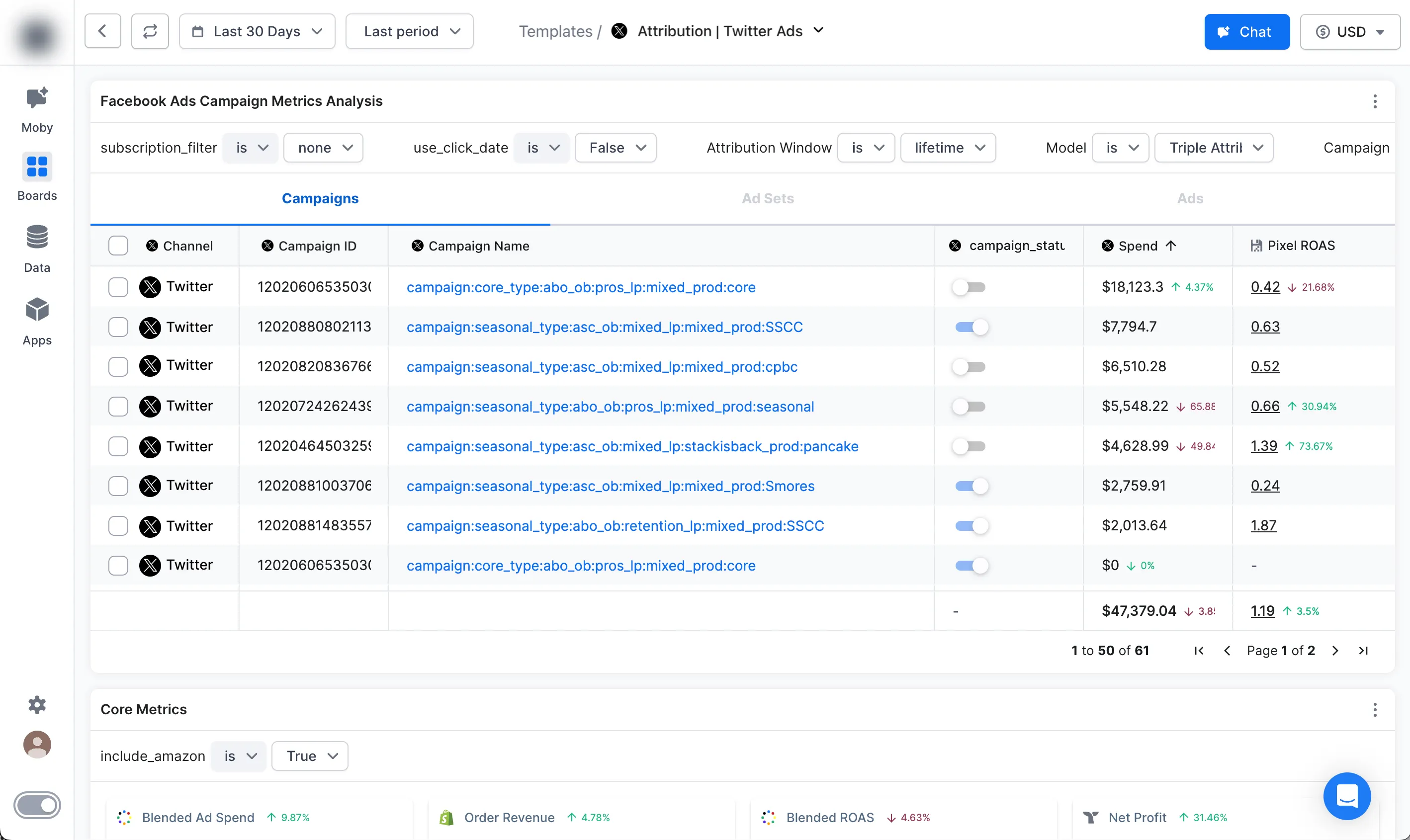 This Board offers a detailed view into the performance of Twitter (X) Ads campaigns, providing ecommerce brands with the insights needed to drive growth. Leveraging Triple Whale's 7 attribution models and AI trained on your data, it delivers a comprehensive analysis of key performance indicators, enabling brands to make data-driven decisions.